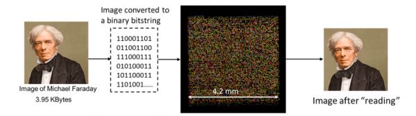 图|用该技术将“电学之父”法拉第的图像(3.95 KB)转换成荧光染料图案,并存储在 4.2mm^2 大小的环氧树脂基底上,打印错误率只有 0.4%(来源:该论文)
