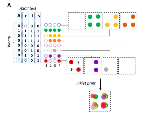 图|荧光分子对文本信息“Arts”进行二进制编码和打印成像示意图(来源:该论文)