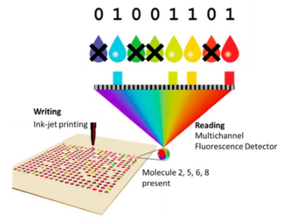 然后,他们使用配备有多通道荧光检测器的荧光显微镜,读取每个点上染料分子的发射光谱并解码信息。这样一来,该检测器可以同时且互不干扰地分辨出基底上任意点的染料信息组合,计算机程序再将二进制码还原为图像/文本,读取过程随即完成。