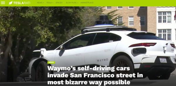 先是特斯拉网站报道了这一新闻,新闻标题为“Waymo 自动驾驶汽车以最奇怪的方式占领了旧金山街道”: