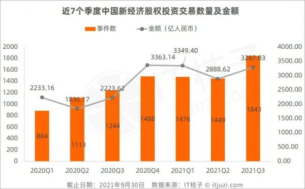 据 IT 桔子数据显示,2021 年前三季度国内新经济股权投资交易数量发生 4770 起,较去年同期增加 47%。投融资总额 9525 亿元,较去年同期增加 51.36%。其中,2021 年 Q3 投资事件数为 1843 起,同比增加 48%,环比增加 27.2%。Q3 投融资交易额为 3287.03 亿元,同比增长 47.8%,环比增加 13.79%。