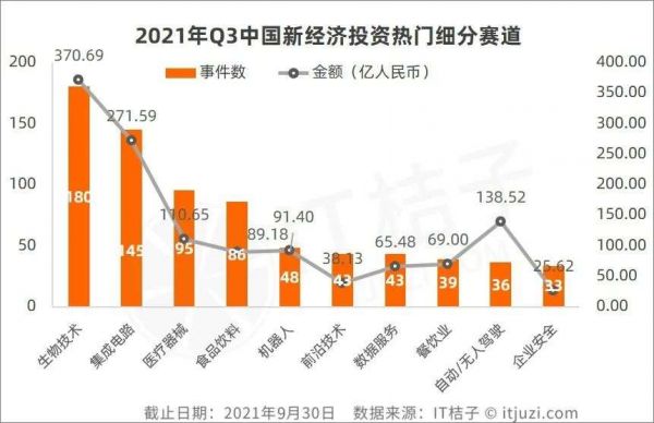 根据 IT 桔子数据,2021 年 Q3 中国新经济投资热门的细分领域主要涉及医疗、企业服务、本地生活等几个大行业,排在前 10 的细分子行业包括生物技术、集成电路、医疗器械、食品饮料、机器人、前沿科技、数据服务、餐饮业、自动/无人驾驶、企业安全。