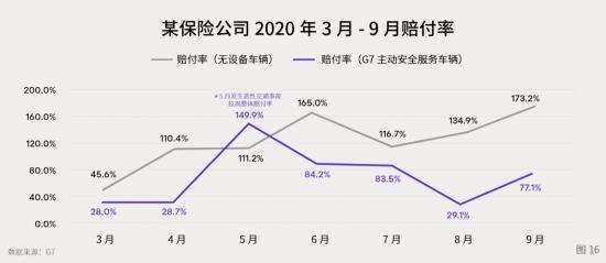 根据G7平台的数据,通过综合手段的主动安全管理能够帮助车队显著降低赔付率,在与某保险公司的合作中,通过在其承保的车辆中推广G7主动安全服务,该保险公司的整体赔付率为75%,而同期未推广主动安全服务的车辆整体赔付率为128%。