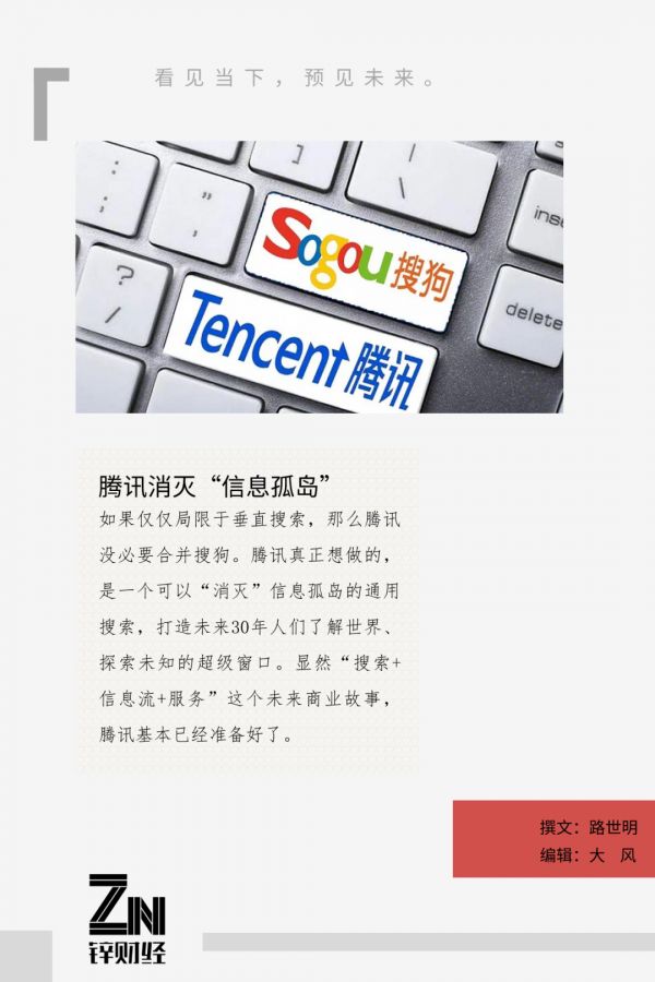 最后就是腾讯。众所周知,腾讯一直有一个搜索梦。拥有海量用户和优质内容的腾讯,串联起两者的基建——搜索,却一直没有被提上战略。而搜狗这个老牌搜索平台,或许将成为腾讯连接用户、内容和服务的一把钥匙。