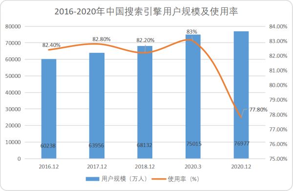 根据中国互联网络信息中心公布的《中国互联网络发展状况统计报告》显示,截至2020年12月,我国搜索引擎用户规模达7.70亿,较2020年3月增长1962万,占网民整体的77.8%。但是,搜索引擎使用率却从83%降到了77.8%。
