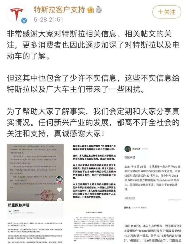 今年5月底,特斯拉法务部在微博上晒出多家自媒体的致歉声明,多与发表不实言论、损害特斯拉品牌声誉有关。此外,为了获取自媒体创作者的联系方式,特斯拉甚至将今日头条也告上了法庭。