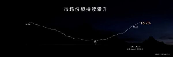 9月22日,荣耀CEO赵明在荣耀Magic 3系列影像技术发布会上透露,荣耀品牌市场份额升至16.2%,距离荣耀历史上的最高峰只差0.5个百分点。在此之前,荣耀市场份额最低曾跌至3%。