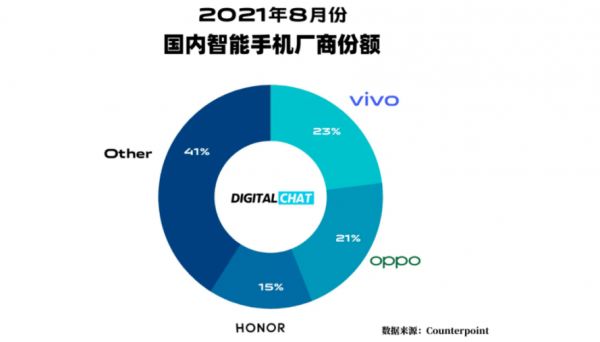 9月29日,Counterpoint Research报告数据显示,8月份荣耀中国区销量同比增长18%,市场份额达到15%,再次跻身国内三强之一,小米、苹果则被列入“other”之列。