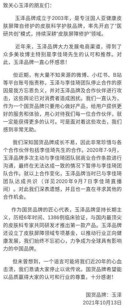 玉泽在这则声明中表示,近期有大量不知来源的微博、小红书、B站等账号,指责玉泽与李佳琦团队停止合作的原因是玉泽“忘恩负义”,并对玉泽品牌进行攻击,为此玉泽“感到非常无助”,恳请网友停止“以讹传讹”。