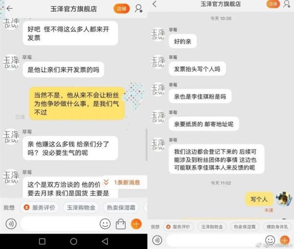 有对其产品价格持疑的粉丝,在玉泽淘宝旗舰店后台要求客服开具发票,有客服回复称,“是他(李佳琦)让亲们来开发票的吗?”这一截图流出,引发了更多粉丝的不满。