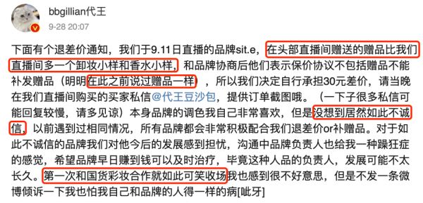 淘宝主播“代王”就自称遭遇了不公平对待。今年9月,代王发微博称,在提前沟通过“赠品与薇娅李佳琦直播间一致”的前提下,合作品牌还是在头部主播的直播间多赠送了一些小样”,品牌还表示不能补发赠品,主播只能自行承担差价。