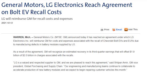 这也就意味着LG化学几乎承担了通用汽车本次召回Bolt EV车型所需的所有费用,而通用汽车在本次召回遭受的损失仅有1亿美元左右。