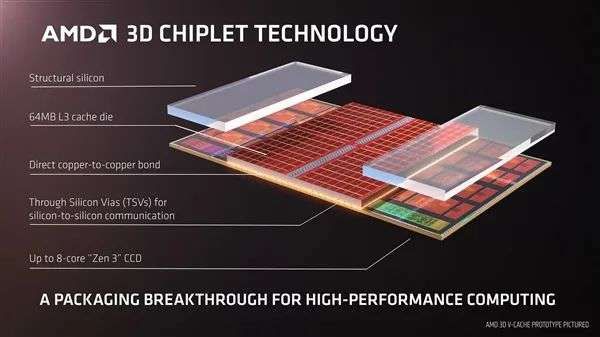 3D V-Cache缓存技术是AMD在今年6月份的台北电脑展上发布的一项新技术,该技术可以将处理器的缓存通过3D垂直堆栈的方式设计,在不改变核心面积的同时让处理器集成大容量的三级缓存,有效提升处理器的性能。