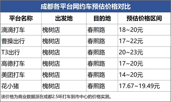 在吴川的提示下,商业数据派在成都也分别用不同的打车软件尝试了相同路段的价格。我们发现,在不使用优惠券的情况下,相同时间,相同路线,美团的价格确实要比其他平台便宜3~4元左右。
