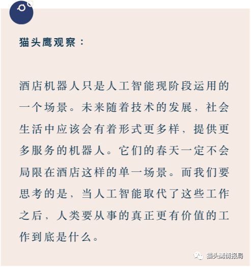 不知道大家有没有在出差或旅游的途中,发现现在酒店里面有越来越多的“机器人服务员”?笔者好几次在酒店叫了客房服务后,拉开房门出现的都是机器人的身影。这就是今天猫头鹰情报局想和大家分享的主题。