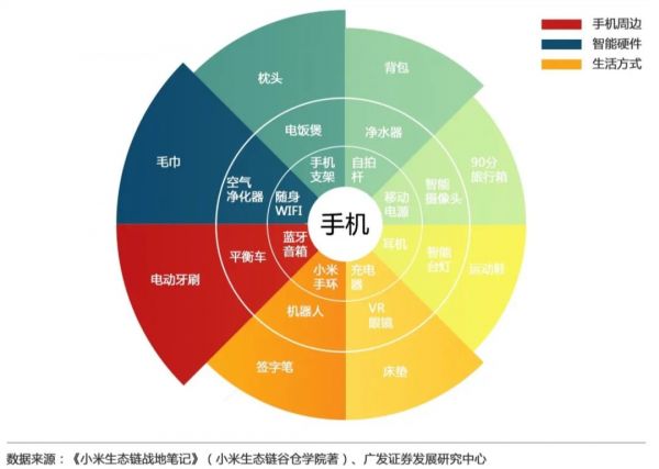 第三步,构建产业链品牌,接入线上线下。 横向看,小米有技术加投资的紫米、华米等生态链企业,也有贴牌供应链的小米有品杂货铺;纵向上看,小米在线上软件服务布局和线下硬件产品、体验店、贴牌店和合纵连横,最终的结果就是在细分市场,如大健康领域拔得头筹,获取自己的一席之地。