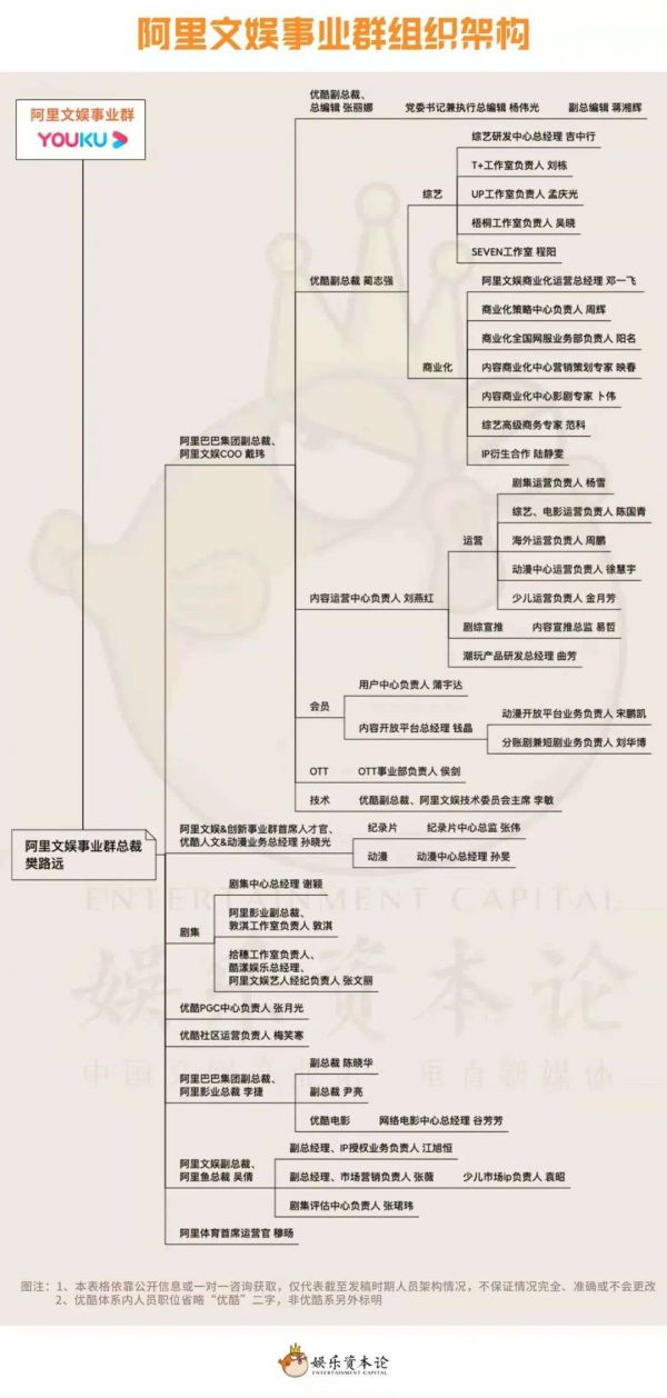 娱乐资本论从公开资料中整理出的事业群近期相关人员信息显示,阿里文娱的人员架构呈现出1-N的模式,樊路远作为事业群总裁,直接面对和处理事业群的多项业务。