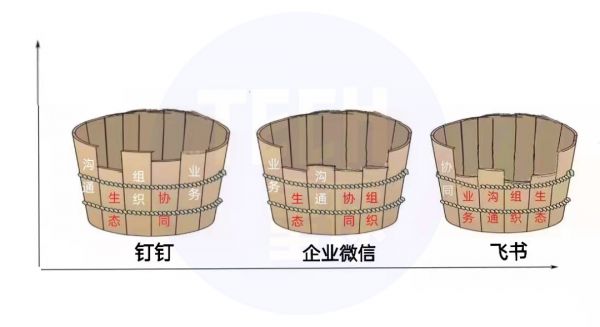 钉钉、企业微信、飞书三款产品,就如同是阿里、腾讯、字节给国内4000万企业组织的“三个水桶”,企业用水桶提水“浇灌”业务。这三个水桶由刻有组织和业务等5个维度的积木构成,像水桶理论一样,各个维度的积木长短不一,造成提水多少也有区别。