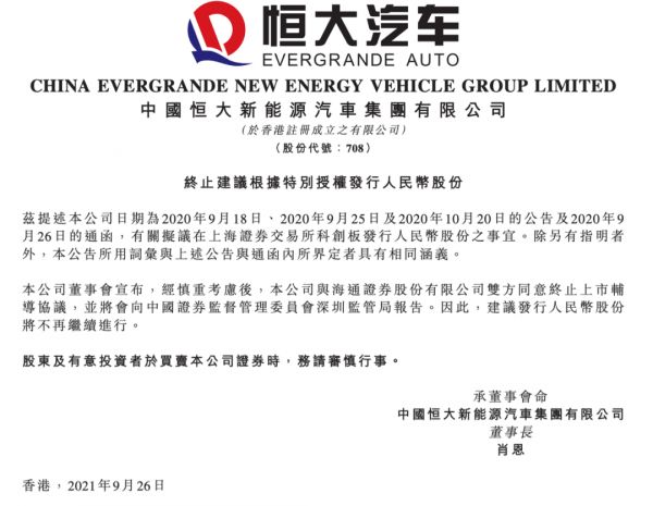 9月26日,恒大汽车发布公告表示,公司与海通证券股份有限公司双方同意终止上市辅导协议。这意味着,恒大汽车主动放弃登陆A股的机会。
