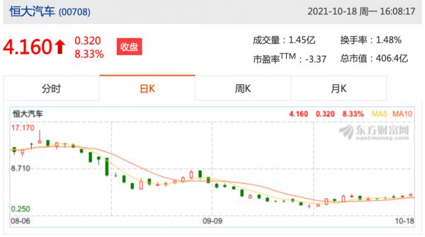 再将时间线提前,10月4日,受负面消息影响,恒大集团的股票在当日上午九时暂停买卖。据老虎证券数据显示,当日恒大汽车股价最低跌到2.77港元。截至今日发稿,恒大汽车股价涨到4.16港元,市值达到406.4亿港元。
