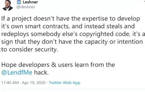 在dforce被盗一事发生后,去中心化平台compound创始人发布推特表示“如果一个项目无法足够专业,无法构建自己的智能合约,而是直接复制源代码,在智能合约的基础上稍作修改,那么他们实际没有成为DeFi安全审查的能力,希望大家从dforce的事件中吸取教训”。