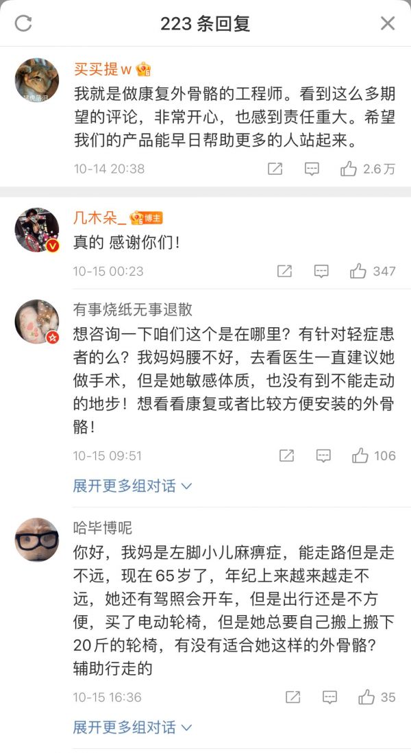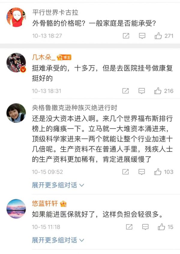 在深度感受着科技温度的同时,越来越多网友(尤其是家里有肢体残疾亲属的网友)对外骨骼设备从最开始的好奇、惊叹到逐渐赋予厚望。