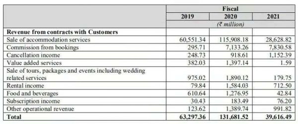 OYO营收组成主要包括住宿服务销售、预订佣金、取消收入、增值服务收入以及旅游、套餐和活动的销售等业务版块。尽管近年来由于其多元化的业务战略,住宿服务占营收比重有所下降,但目前来看仍是OYO的基本盘。OYO的住宿服务收入在2018、2019、2020财年分别605.51亿卢比、1159.08亿卢比、286.29亿卢比,占总体营收的比重分别为95.66%、88.02%、72.26%。