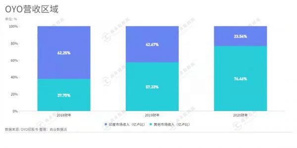 从区域分布上看,OYO营收主要来源于印度市场和其他国际市场,2018财年-2020财年,OYO来源于印度市场的收入分别为394.02亿卢比、561.84亿卢比、93.24亿卢比。印度市场收入占整体收入的比重大幅下降,从2018财年的62.25%下降至2020财年的23.54%。