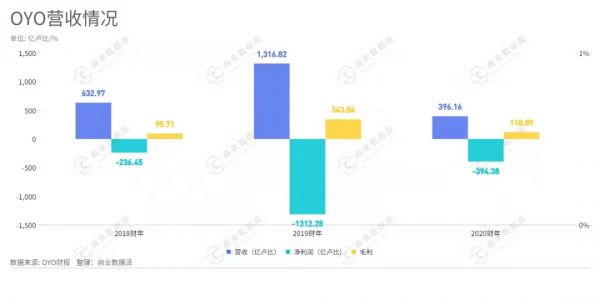 在2018(2018年4月1日-2019年3月31日,下同)、2019(2019年4月1日-2020年3月31日,下同)、2020(2020年4月1日-2021年3月31日,下同)财年里,OYO的营业收入分别为632.97亿卢比、1316.82亿卢比、396.16亿卢比,受疫情影响,2020财年营收大幅下挫。与此同时,在全球市场的激进扩张策略也导致其亏损居高不下。该公司2018年-2020财年亏损分别为236.45亿卢比、1312.28亿卢比、394.38亿卢比。