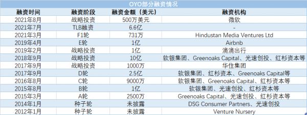 天眼查APP显示,自创立起OYO累计共完成20轮融资,金额超65亿美元(约合人民币超400亿元),其中不乏软银集团、红杉资本、光速创投等知名投资机构的身影,还包括了滴滴、华住集团、Grab、Airbnb、微软等企业投资方。值得一提的是,微软在今年8月以90亿美元估值出资500万美元对OYO进行了投资,这也是OYO进行IPO前的最后一轮融资。