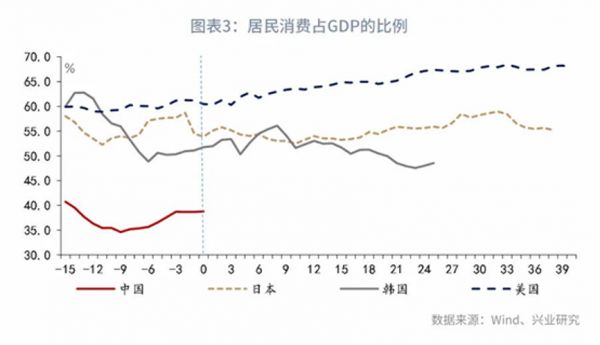 之所以认为中国新消费的发展会更加长期和强劲,是由于相比于美、日、韩而言,中国居民消费的上探空间更大,而这背后是中国发展国情导致的。以人均GDP1万美元为节点,美国居民消费GDP占比60.5%,日本和韩国达到53.9%和51.8%,而中国居民消费占GDP比例为38.8%,提升空间巨大。