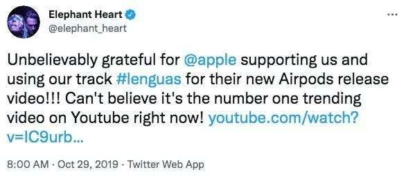 2019年,苹果公司推出了火爆至今的降噪耳机AirPods Pro,新品广告片在发布当天立刻占据了Youtube播放量榜单首位,其配乐Lenguas下载量随之飙升,连歌曲制作人Elephant Heart都表示激动得不敢相信。