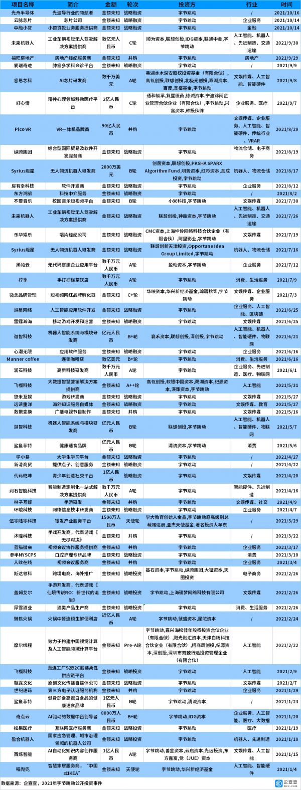2021年,字节跳动公开投资事件