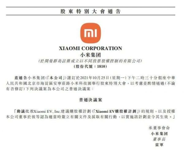 十一假期前一刻,小米集团发布公告,将于10月25日举行股东特别大会,以批准采纳Xiaomi EV(小米智能电动汽车业务)的股权激励计划,计划授权上限为10亿股,占Xiaomi EV已发行股份总数的10%。