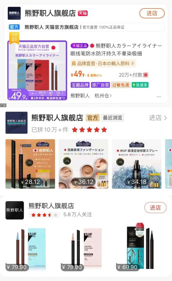 与Colourpop经历相似的,还有因一款眼线笔走红社交媒体的日本品牌UZU(熊野职人)。天猫、京东、拼多多三大电商平台与抖音平台上,均有“熊野职人旗舰店”。其中,拼多多与抖音旗舰店为同一经营主体。