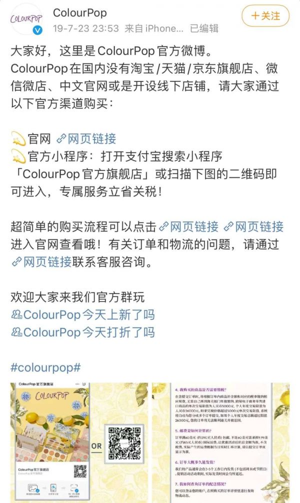 Colourpop已经开始行动。其美国总公司于2019年注册新浪微博,在品牌官网和微博同步声明,品牌并未在国内开设淘宝/天猫/京东旗舰店、微信微店、中文官网或线下店铺。此后,Colourpop还曾入驻小红书,并与支付宝合作,开设支付宝小程序旗舰店,官网支持支付宝付款、直邮国内。