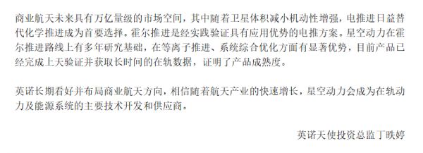 此外,邓沙介绍说,星空动力20-40mN的产品将在今年12月搭载某国有科研院所小行星探测卫星进行在轨验证,小行星探测卫星的目标是前往离地球2亿公里外的小行星带进行科学探测,星空动力的产品可为其提供持久可靠的动力。