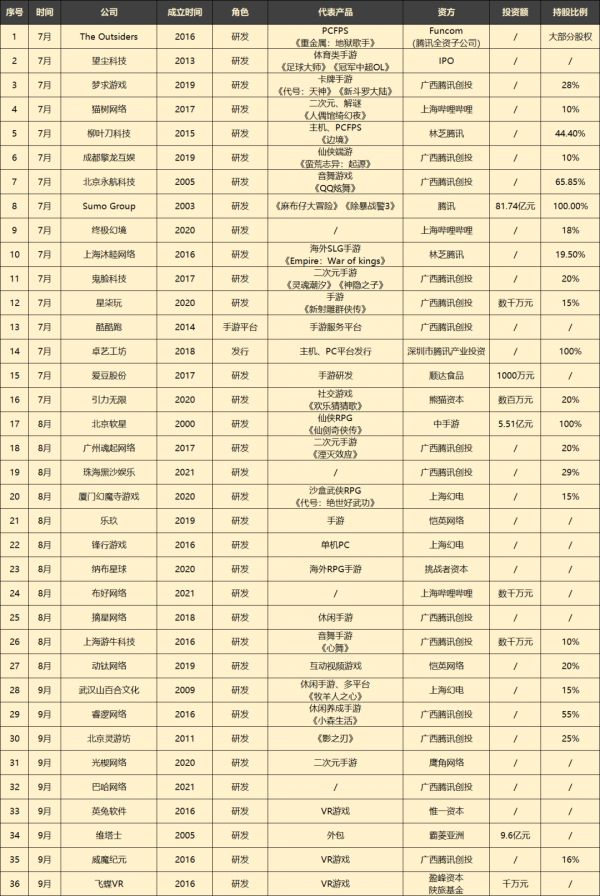 整个2021年前三季度,腾讯已经在游戏圈投了60余家公司,研发为主,也涉及多平台发行、游戏社区、动漫设计、渠道等,有公开信息显示的总金额已经超过100亿元。