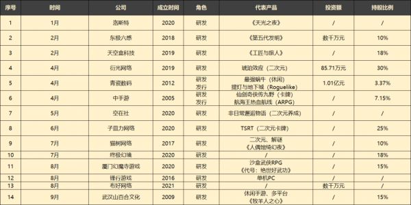 和Q2不同的,Q3紧跟腾讯快节奏的不再是字节跳动,而是B站。在本季度,B站一共投了6家公司,全是研发,研发方向包括沙盒武侠、二次元解谜、单机PC、休闲等多个,持股比例均在10%以上。
