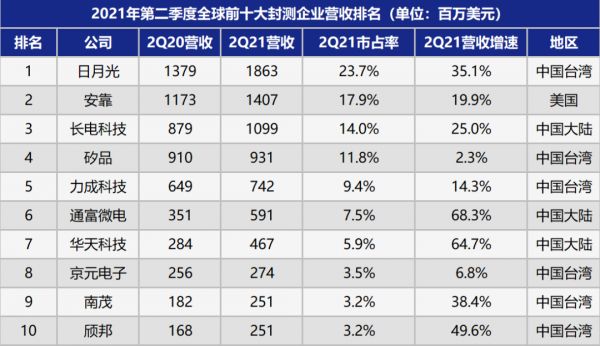 据TrendForce公布的报告,2021年Q2季度,全球封测市场规模排名前十的厂商中,有6家来自于中国台湾,合计市场份额占比54.8%;3家来自中国大陆,合计市场份额占比27.4%;仅有安靠一家来自美国,市场份额占比17.9%。