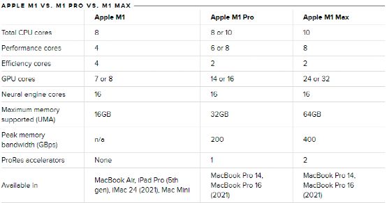 但MacBook Pro的风光很快便被搭载的M1 Pro与M1 Max处理器给抢了。据悉,M1 Pro虽然仍是5nm工艺,但是晶体管由M1的160亿提升至337亿个,内置了一颗十核心的CPU,包括了8个性能核心和2个效率核心,其处理器性能相比M1提升了70%,16个GPU核心让它拥有2倍于M1的图形性能,其最高支持的内存也由16GB提升至32GB,内存带宽达到200GB/s。