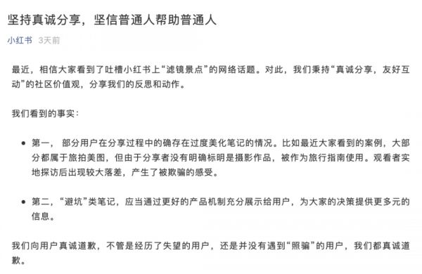 随着负面舆论的爆发,小红书也出面道歉。同时也提出解决方案,包括鼓励小红书发布者做有用而非美化的分享,推出景区评分榜、踩坑榜等产品。