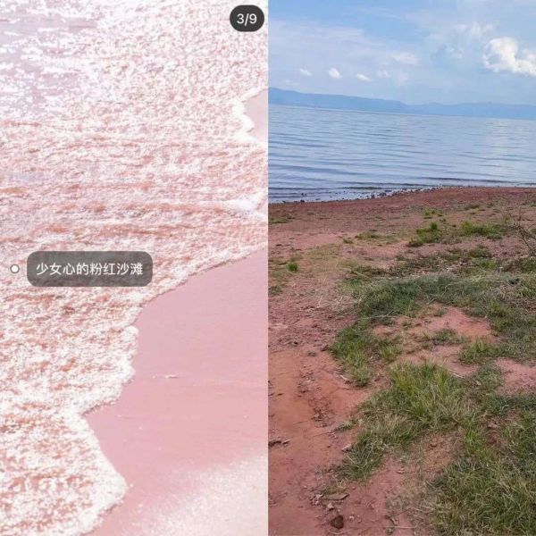 粉红沙滩景点,左图来源于小红书博主,右图来源于微博@你的镜仔没改名次数版