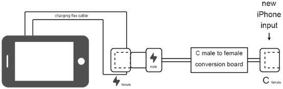 设计之初,Pillonel 首先研究了 USB-C 规范文档和数据线的内部结构后,设计出一种逆向链接微型化 USB Type-C 母口方法。其中 Lightning 端口的内部连接如下图所示: