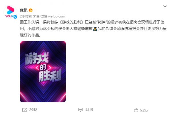 晚间,优酷官微对此事回应称,“因工作失误,误将新综《游戏的胜利》已经被“毙掉”的设计初稿在招商会现场进行了使用 ”,并发布了节目新名字海报。不过从微博广场相关词条下用户的反应,这个反应显然难平众意。