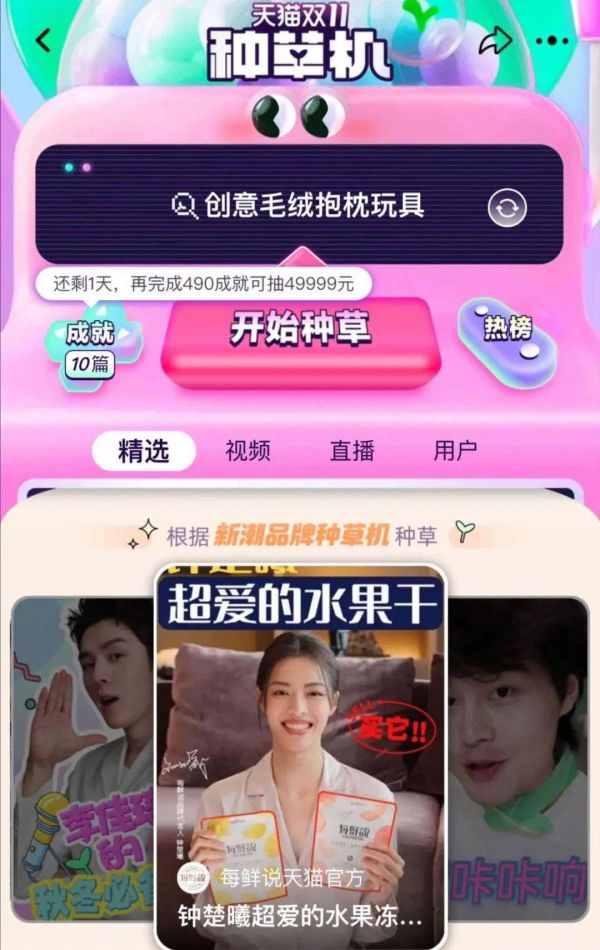 ② 上线双11种草机:手淘首页的逛逛界面中,上线了一项名为“种草机”的新功能,消费者点击“种草”就能看到海量内容并快速把商品加入购物车。目前,已经有不少明星和红人把自己的囤货清单及同款好物分享在种草机中供消费者参考。该功能也是淘系平台在种草形式上的新尝试。