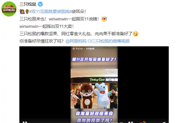 除却站内为商家带来不同方面的流量加持,天猫在站外的宣传营销上也下了不少功夫。今年,阿里妈妈旗下IP人物“袋耳朵”成为双11加油官,运用近期网络较为热门的“袋鼠摇”一梗拍摄短视频《双11袋鼠摇全员打气舞》,鸿星尔克、百雀羚、三只松鼠等品牌也加入该宣传活动。目前,#双11见面就要袋鼠摇#微博话题阅读量已经达到7200万。