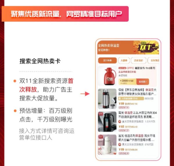 百度:10月14日,百度也发布《零售双11营销攻略》,表示将贴合大促需求,提供给电商客户(跳往淘宝/京东等)的投放解决方案;首次释放全新搜索资源,助力广告主搜索大促方量;自动定向+双11定制人群包,精准触达目标人群等。