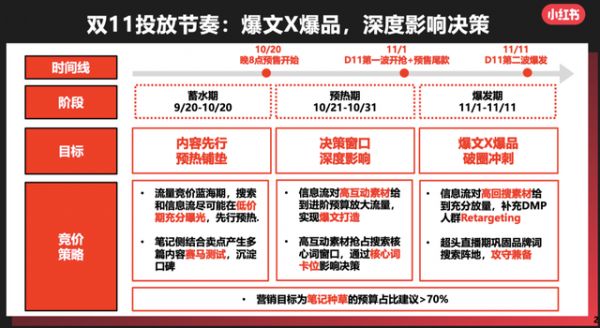 小红书:近两年一直在不断接入电商模式的小红书,今年双11前夕似乎却弱化了电商功能。在十一假期前推出的双11营销手册中,其营销核心目标是“抢占注意力”,重心还是在种草布局上面。而小红书一直在努力尝试的直播带货,在这次双11营销手册中却并没有看到相关营销内容。