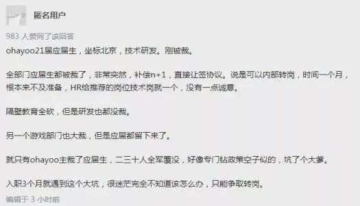一张流传在互联网的截图引起了大家注意,有知乎用户今天下午发文称,他是字节跳动Ohayoo的2021届应届生员工,在技术研发部门工作,刚刚被裁。该用户提到,其部门二三十个应届生都被裁了,补偿N+1。